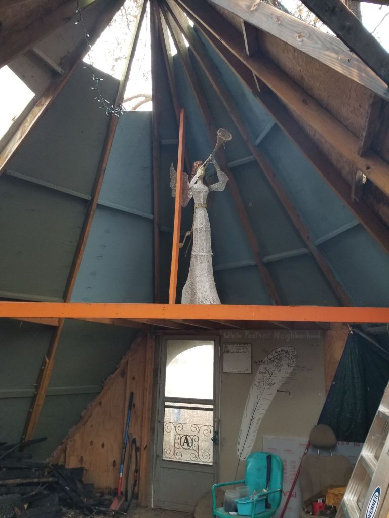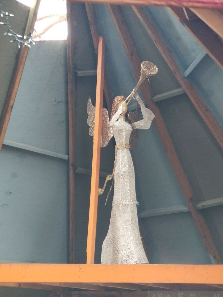 So I ventured out into the 30 and 40 or more mph winds. I had an angel display to rescue. Not a real angel. They rescue me! I see them with me as huge limbs bounced around over my head in the trees. We have some big trees. One is right over the teepee. I rescued the angel and she now has found her home in the loft of my teepee. It’s perfect!
